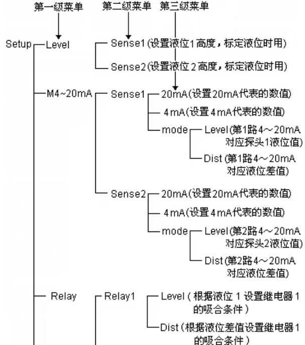 Mode->顯示Level菜單(dān),點▼-> 顯示M4~20mA菜單(dān),點OK->顯示Sense1菜單(dān),點▼->顯示Sense2菜單(dān),點OK->顯示20mA菜單(dān),再點▲/▼鍵翻到mode菜單(dān),點OK->顯示Level菜單(dān),點▲/▼選擇第二路模拟4~20mA電流輸出代表探頭2的液位Level還是液位差Dist,選擇好後點OK->回到mode菜單(dān),點▲/▼鍵選擇對4 mA還是20mA進行設置,選擇好後點OK ->輸入該電流相對應的液位值或液位差值(單(dān)位米),點Mode->回上一級菜單(dān),點Mode->回到M4~20mA菜單(dān),點Mode->顯示Exit菜單(dān),點OK->儀表保存數據並(bìng)複位。