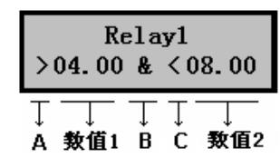 當編(biān)輯繼電器邏輯時,閃動的數字爲當前可更改的數字。點▲/▼鍵,數字會變化,點OK鍵閃動光标會移到下一數字上。繼電器的邏輯是由“A、數值1、B、C、數值2”五部分組成。其中A和數值1,組成瞭(le)繼電器吸合的前一個條件;C和數值2,組成瞭(le)繼電器吸合的第二個條件。