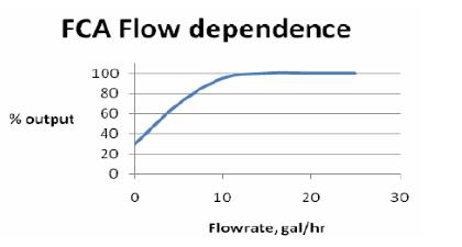 餘氯傳(chuán)感器對流量較敏感,低位流量要求不小於(yú)0.5 英尺/秒,利用恒流量控制裝置提供穩定的樣品流量,流量控制在10-80 gal/h之間爲宜。(電流輸出與流量關系曲線見下圖)